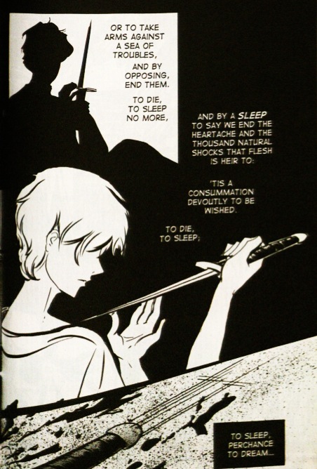 “To Be or Not to Be Soliloquy – Manga Edition.” Adam Sexton and Tintin Pantoja, Shakespeare’s Hamlet: The Manga Edition (Hoboken: Wiley, 2008). 77-78. Print.
