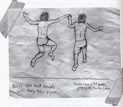 Image on page 219 of PTI. The image shows Rowdy and Arnold jumping into turtle lake when they were in third grade. It is important to note that unlike many of Arnold’s other illustrations, this drawing depicts a realism that differs greatly from the other “cartoonish” drawings that Arnold usually includes in his diary.