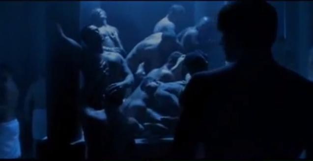 Screen capture from Season 1, Episode 18 of Queer as Folk (U.S. Version). This scene depicts the “Whitmanesque” version of gay bathhouses according to the views of Dennis Altman. Notice that similar to the fantasy of the bathhouse as a democratic space, the bathhouse in this scene projects an aura of fantasy and the mystical as male bodies mingle indiscriminately with each other.