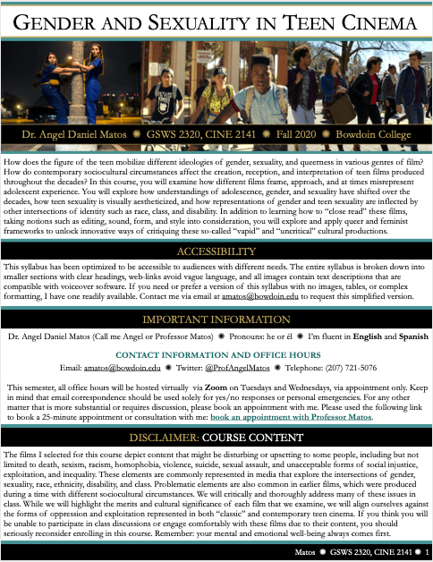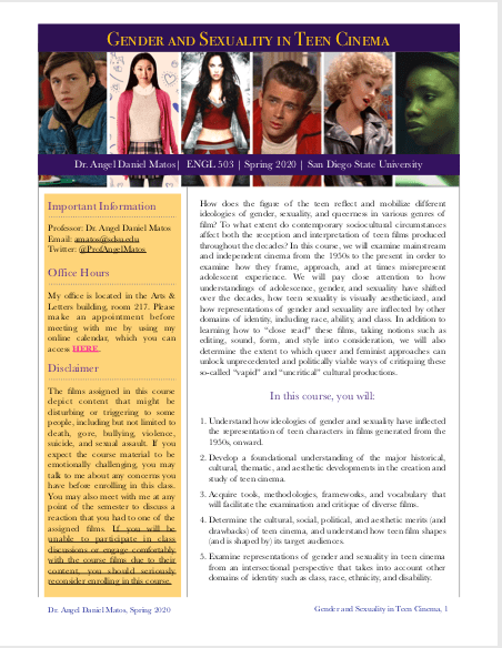 Gender and Sexuality in Teen Cinema (ENGL 503, Spring 2020)