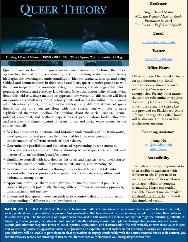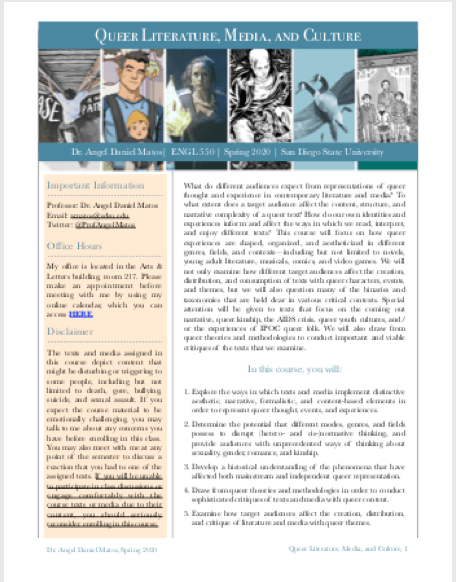 Course Description: Queer theory, or better put, queer theories, are dynamic and elusive theoretical approaches focused on deconstructing and dismantling reductive and binary ideologies that oversimplify understandings of identity, sexuality, kinship, and being. Critical and countercultural in their scope and focus, queer theories provide us with the means to question the normative categories, binaries, and ideologies that inform popular, academic, and everyday knowledges. Given the impossibility of narrowing down this field to a single method or approach, my version of this course will focus on examining a small selection of primary texts and media (including novels, young adult literature, comics, film, and video games) using different strands of queer theory. By the time you are done with this course, you will have a more sophisticated theoretical toolbox for thinking about the social, cultural, sexual, political, emotional, and aesthetic experiences of people whose bodies, thoughts, and practices are aligned against different norms and social expectations. In this course, you will: 1) Develop a succinct foundational and historical understanding of the frameworks, ideologies, events, and practices that informed both the emergence and transformation of different strands of queer theory; 2) Determine the possibilities and limitations of representing queer content to different audiences, and explore the relationship between queerness, content, and matters of form/medium/genre/structure; 3) Familiarize yourself with how theories, histories, and approaches can help you to rethink the queer potentialities present in texts, media, and everyday life; 4) Examine queer texts and media through intersectional lenses that take into account other axes of power such as gender, race, ethnicity, class, culture, and nationality, among others; 5) Appreciate how queer theories can give you the means to conduct politically viable critiques that potentially challenge different forms of systemic oppression, discrimination, and inequity; and 5) Understand how queer theory can push us to recontextualize and transform our understanding of different cultural productions.