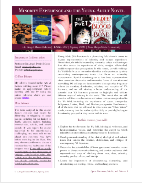 Course Description: Young Adult (YA) literature is a pioneering field when it comes to diverse representations of identity and human experience. Nonetheless, the field is haunted by normative values and ideologies that often center the experiences of white, straight, able-bodied, middle-to-upper-class protagonists. In this course, we will challenge the YA field’s focus on normative identities and experiences by solely examining contemporary texts that focus on minority representation. Special attention given to how these representations often necessitate alternative and innovative forms of narration and storytelling. We will explore the normative ideologies that frequently inform the creation, distribution, criticism, and reception of YA literature, and we will develop a better understanding of the potential that YA literature possesses to highlight and validate different ways of existing in the world. The novels that we will examine will focus on characters and voices that are marginalized in the YA field, including the experiences of queer, transgender, Indigenous, Latinx, Black, and Persian protagonists. Furthermore, all of the texts that we will read in this course are “Own Voices” novels, meaning that the authors (either fully or partially) belong to the minority groups that they center in their texts.