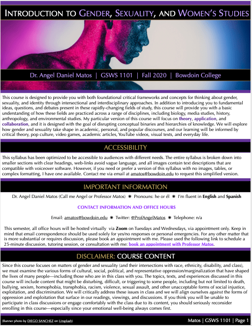 Be a kind human and give me credit if you use any of my syllabi as inspiration for your own courses. If you’re interested in including these syllabi as a resource in your website, course, or book, please contact me using the links on the homepage. All of these syllabi were designed using a combination of Mac Pages, Adobe Photoshop, and Canva. The images and media used in these syllabi fall under the principles of fair, educational use since they are being used for noncommercial instruction, contribution to a field of knowledge, and curriculum-based purposes.