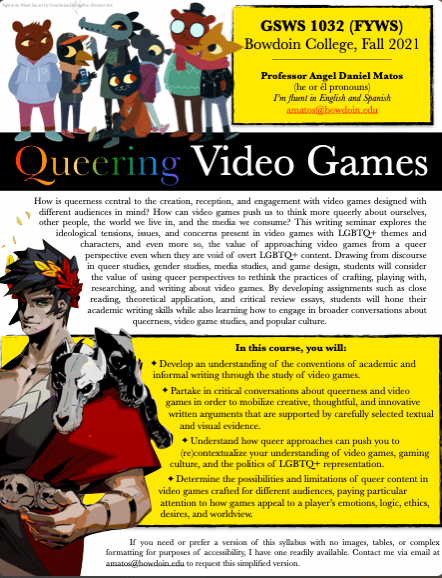 Course Description: How is queerness central to the creation, reception, and engagement with video games designed with different audiences in mind? How can video games push us to think more queerly about ourselves, other people, the world we live in, and the media we consume? This writing seminar explores the ideological tensions, issues, and concerns present in video games with LGBTQ+ themes and characters, and even more so, the value of approaching video games from a queer perspective even when they are void of overt LGBTQ+ content. Drawing from discourse in queer studies, gender studies, media studies, and game design, students will consider the value of using queer perspectives to rethink the practices of crafting, playing with, researching, and writing about video games. By developing assignments such as close reading, theoretical application, and critical review essays, students will hone their academic writing skills while also learning how to engage in broader conversations about queerness, video game studies, and popular culture.