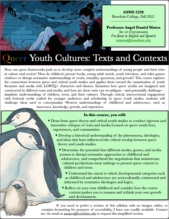 How can queer frameworks push us to develop more complex understandings of young people and their roles in culture and society? How do children’s picture books, young adult novels, youth television, and video games reinforce or disrupt normative understandings of youth, sexuality, queerness, and growth? This course explores the connections between queer and critical youth studies and applies them toward the examination of youth literature and media with LGBTQ+ characters and themes. Examines how queer youths are imagined and constructed in different texts and media, and how are these texts can reconfigure—and potentially challenge—simplistic understandings of children, teens, and their cultures. Through critical, intersectional engagement with fictional works crafted for younger audiences and scholarship in queer youth studies, students will challenge ideas used to conceptualize Western understandings of childhood and adolescence, such as innocence, knowledge, growth, and experience.